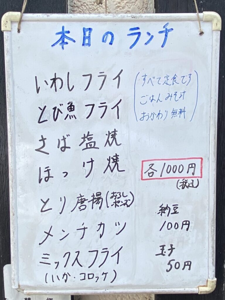 店前に掲げられたランチメニュー、すべて1000円。定食でご飯と味噌汁おかわり無料。