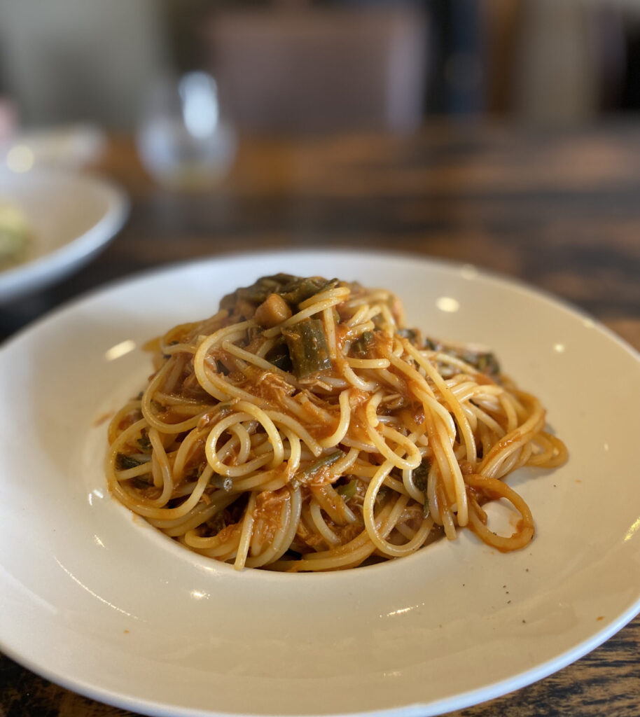 想像していたトマトソースよりは、少しトマト味が抑えられていた印象。空心菜は中華料理でしか食べたことがなかったが、スパゲッティにも合うのだなぁと感心。