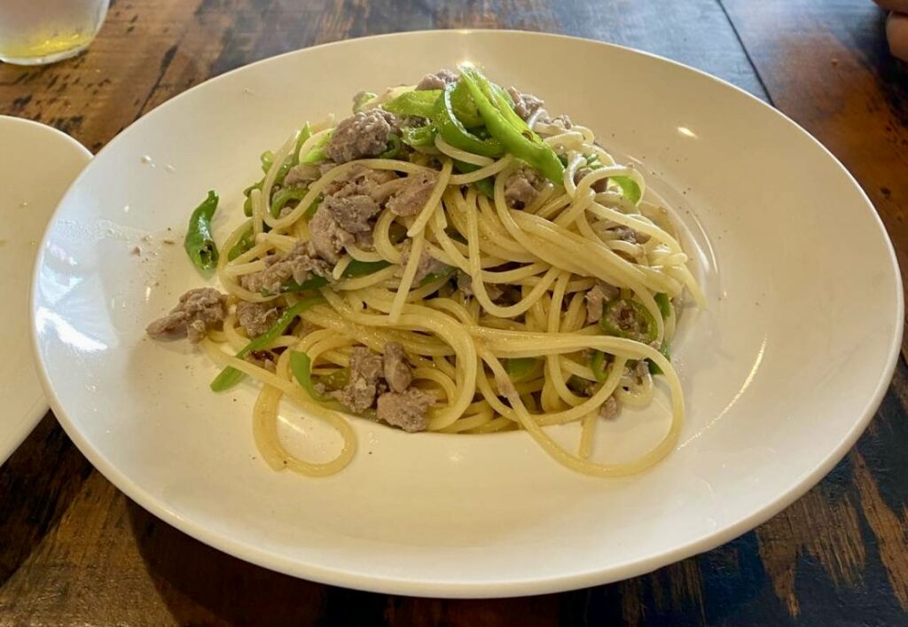 トマトソースの方は小柱、空心菜がソースと一体になってスパゲッティを構成しているとしたら、こちらは鶏のサルシッチャくんと万願寺唐辛子くんがそれぞれ個を大切にしながら語りかけてくる感じだ。