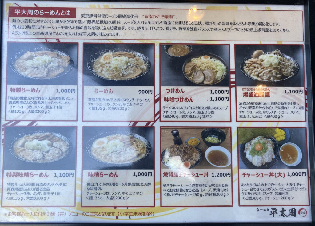 平太周には店前の看板説明通り様々ならーめんとチャーシュー丼の定食、そしておなじみのトッピング系がならんでいる。
