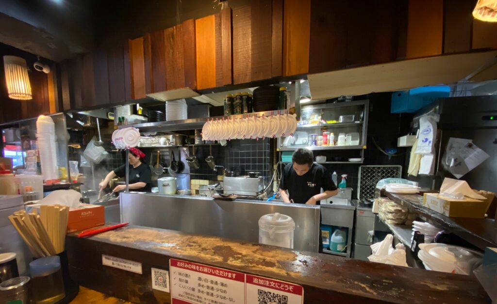 店の小さな入り口に対して、存在感が強すぎる巨大なダクトと麺コンテナを横目に見ながらいざ店内へ