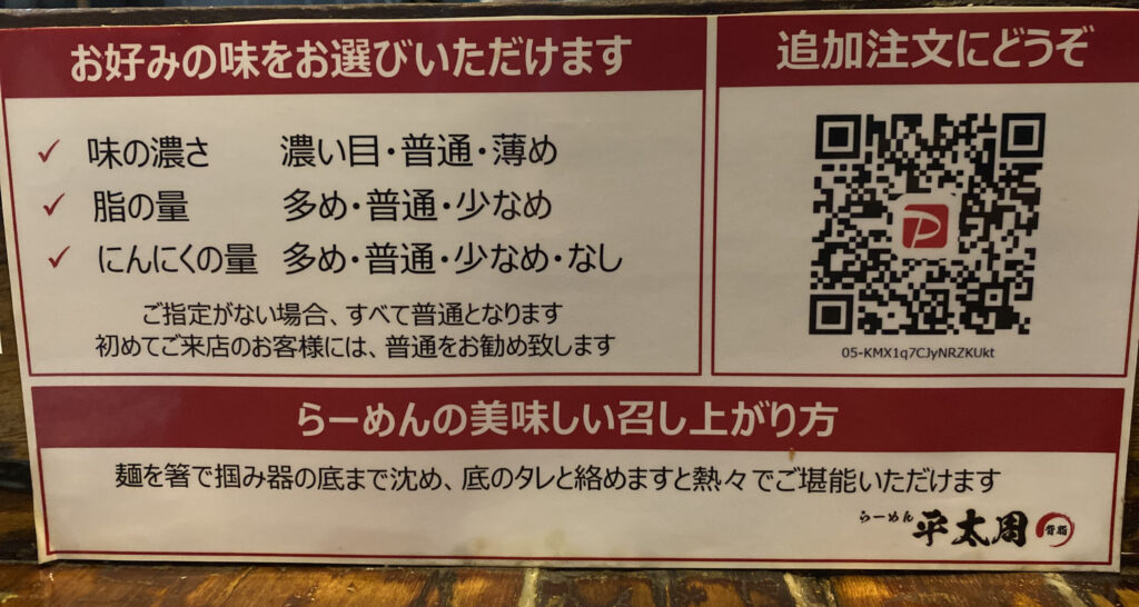 こちら平太周のお好み設定。味の濃さと、背脂の量、そしてにんにくの量を選択できる。pay payから追加注文もできるハイテクぶりだ。