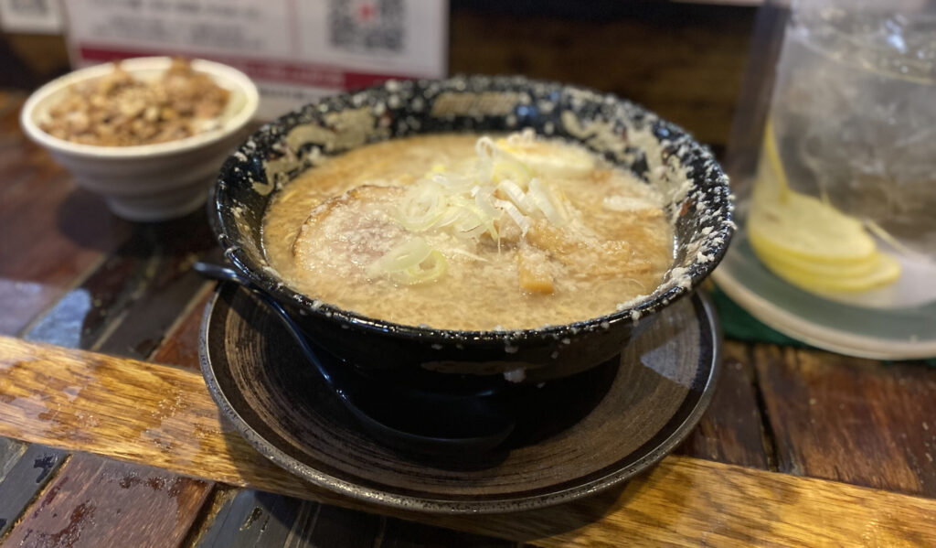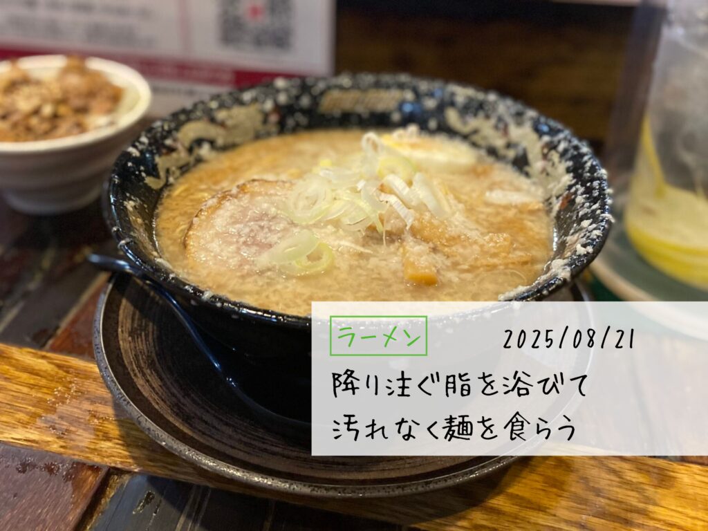 間もなくらーめん大盛り(900+150円)が到着。見よ、この完成された脂の芸術を。背脂系あるあるの、上からちゃっちゃするから器の周りにも背脂が付くアレである。