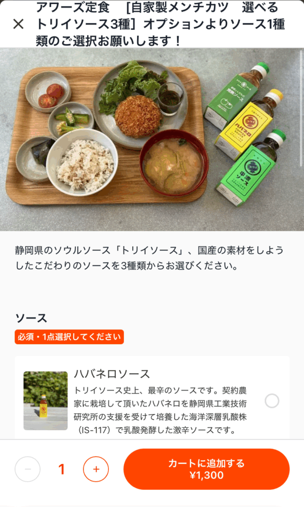 アワーズ定食 自家製メンチカツ ハバネロソース選択(1300円)