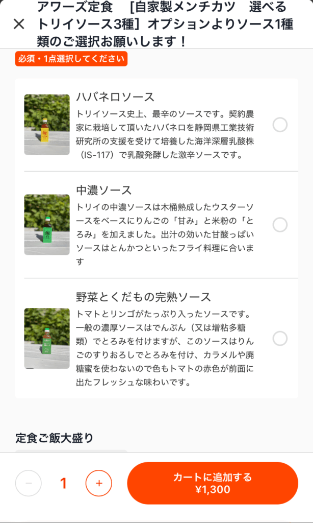 今回はアワーズ定食の自家製メンチカツをいただくことにしたのだが、そこからさらにソースを選んだり味噌汁をアップグレードしたりもできるようだ。