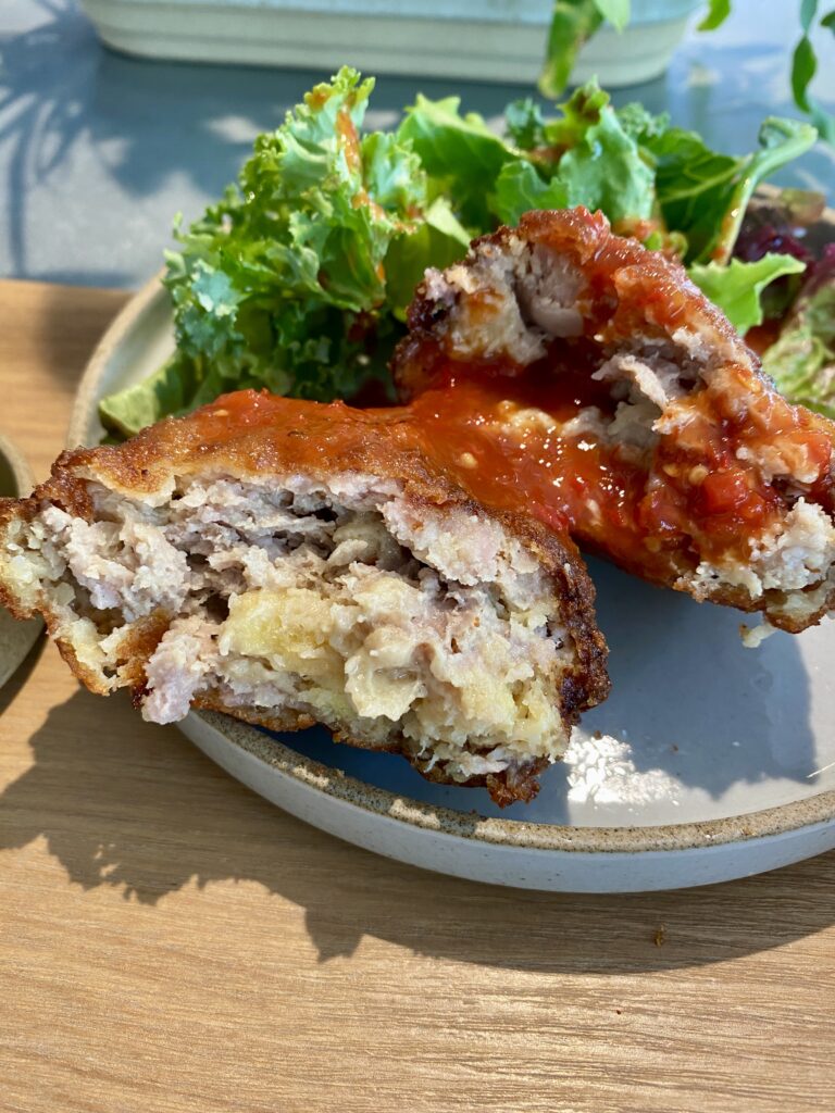 断面はこんな感じ。メンチのひき肉はかなり粗挽きな印象。
