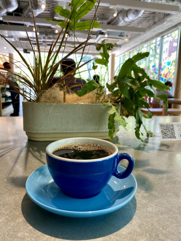 食後にコーヒー(500円)を注文。ランチを注文したので、セット料金が適用され300円引きとなり実質200円で飲むことができる。