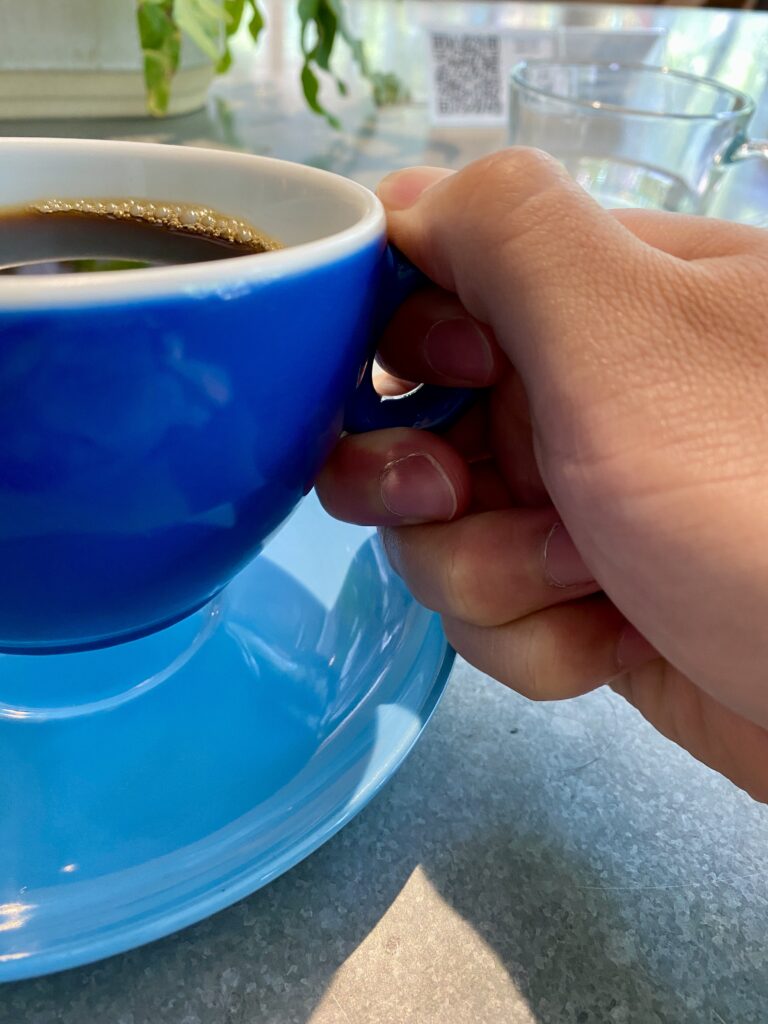 ちなみに、このカップ持ち手が小さいのに意外と重いので持ち方に気を付けてほしい。個人的に落ち着いた持ち方は人差し指を小さな穴に入れ、親指と中指でわっかの外側を固定する持ち方だ。