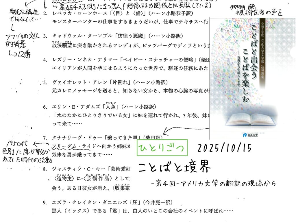 小説や映画における恐怖の構造でもいいし、テクノロジーと翻訳家の関係性の変化でもいい。
